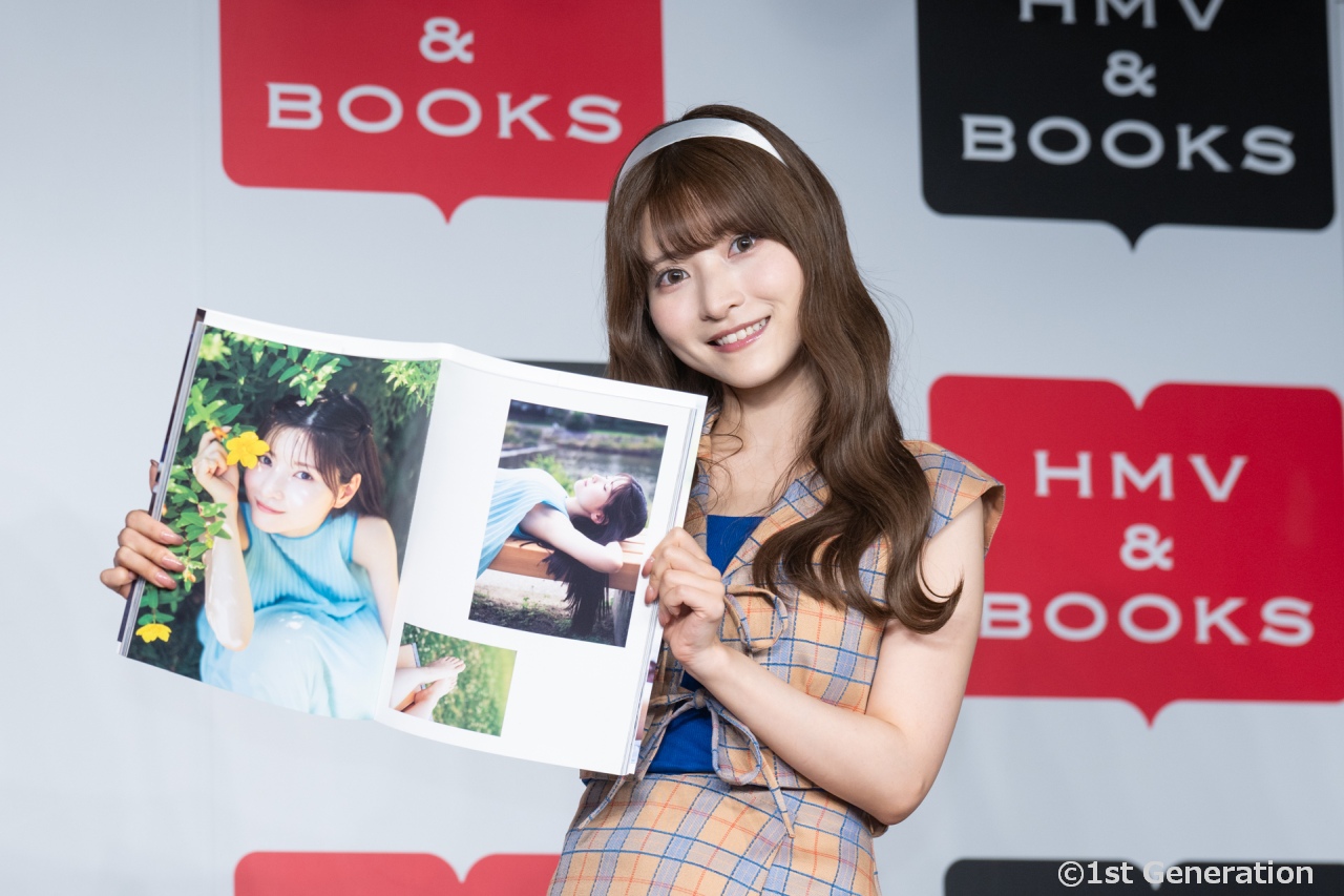 イベントでは、写真集への想いや撮影の裏話をたっぷりと語りました。 6月上旬に秋葉原と京都で4日間かけて撮影されたという本作。 お気に入りのページについては、鮮やかな青いワンピースを着用したカットを挙げ、「普段とは違う大人っぽい雰囲気と、子供っぽさも両方あるところが気に入っている」と笑顔を見せました。