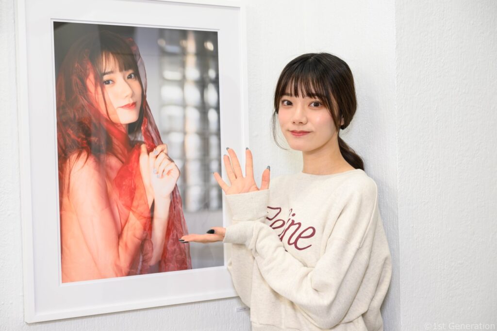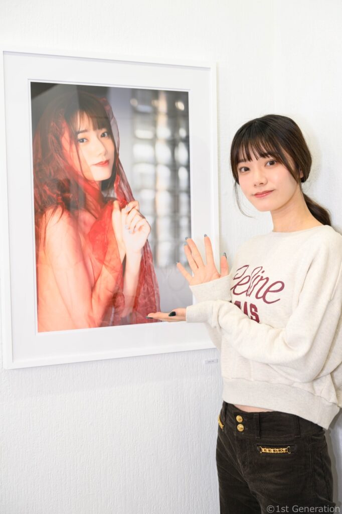 会場では、写真集では見られない様々なサイズで表現された写真が楽しめる。玲奈のお気に入りは、ネコのようなポーズで大人っぽさを表現した、笑わない表情の作品だそうだ。撮影中は「無」の状態で自然体で臨み、カメラマンの指示に従ったり、自身でポージングを考えたりしながら撮影に臨んだという。ぜひ、写真展で確認してほしい。