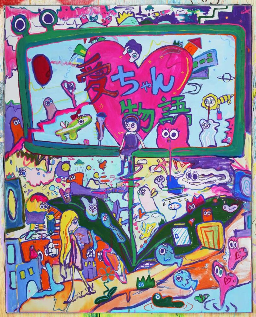 私は多様性を大切にしています。だから絵のキャラクターはいつも変な生き物ばかり。そして今、自分たちが生きているこの世界はクレイジー。だけどそれでも生きていかないと。どうせ、生きるならポップに明るく描きたい。それが自分の色。そして、自分の絵画制作、映画、全てのアートワークは繋がっています。映画のキャラクターは、この絵の世界に迷いこみ、不思議な生き物は映画を見にくる、そして「愛ちゃん物語♡」の世界に入っていきます。