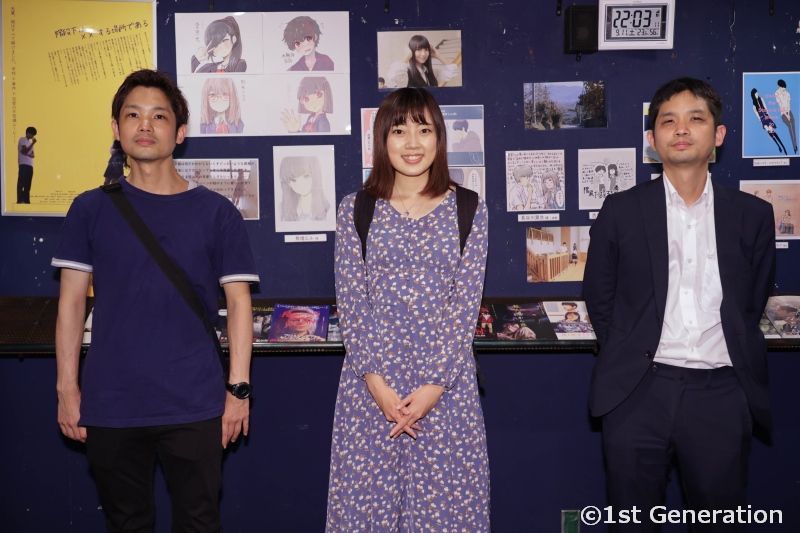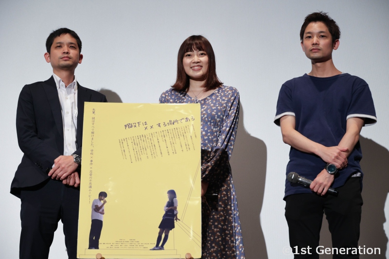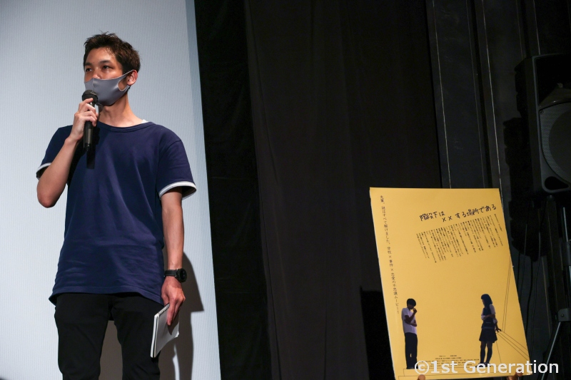 映画『階段下はxxする場所である』の上映初日、神谷正智(かみや まさとも)監督、制作・脚本の神谷正倫(かみや まさみち)、杉尾優香(すぎお ゆか)が登壇した。主演のひとり、安慶名晃規(あげな こうき)はコロナ禍における緊急事態宣言の影響もあり、県外からの移動を避け、映像コメントでの参加となった。