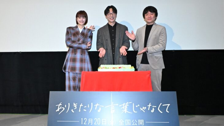 映画『ありきたりな言葉じゃなくて』完成披露上映会。前原滉にサプライズ!小西桜子画伯が描いた似顔絵ケーキでお祝い!