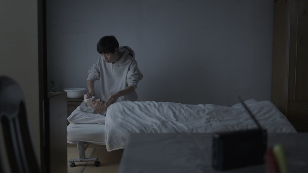 私の祖父は認知症と筋ジストロフィーにより、亡くなる数年前から寝たきりの状態でした。地元にある祖父の病室に立ち寄るたびに、二人で静かな時間を過ごしていましたが、その時過ごした祖父との最後の時間が本作制作のきっかけになっています。約4年間かけて脚本を第二稿まで書き上げ、そこからは俳優さんと一緒にリハーサルや対話をしながら脚本の改稿を進め、最終的な撮影稿は第9稿となりました。撮影現場でも、脚本をもとにして常に俳優さんに即興演技を行ってもらいながら、映画の可能性を広げていきました。「自分が思う映画とはどんなものだろう」と模索しながら、その瞬間一度きりしか生まれない時間を見つけることを目指し、撮影を行いました。