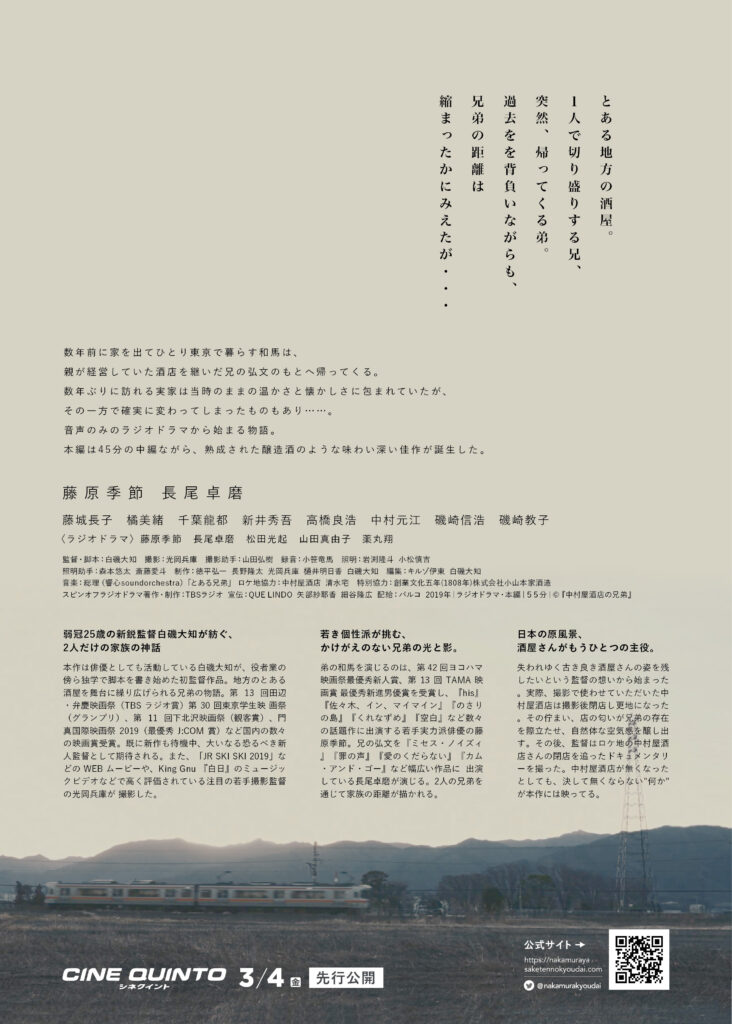 本作は俳優としても活動している白磯大知監督が、役者業の傍ら独学で脚本を書き始めて初監督した作品。徐々に数を減らしている現代の町の酒屋にスポットを当て、兄弟を通じ家族の距離を描いたヒューマンドラマ。