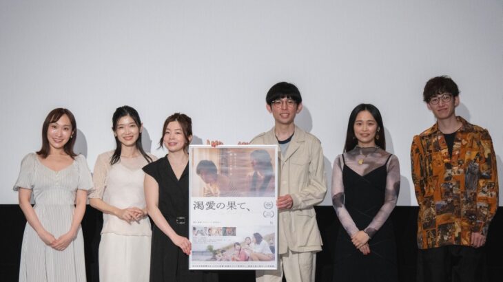 映画『渇愛の果て、』の初日舞台挨拶が5月18日(土)、新宿K’s cinemaにて行われ、監督・脚本・主演の有田あん、妻・眞希の妊娠・出産に向き合う夫・山元良樹役の山岡竜弘、母親としての先輩・竹中里美役の小原徳子、未婚の女優・白井桜役の瑞生桜子、仕事を理由に妊娠を先延ばししているキャリアウーマン・東堂美紀役の小林春世、「役者だけに集中したい」と言う桜の彼氏・中西隆役の二條正士が登壇した。