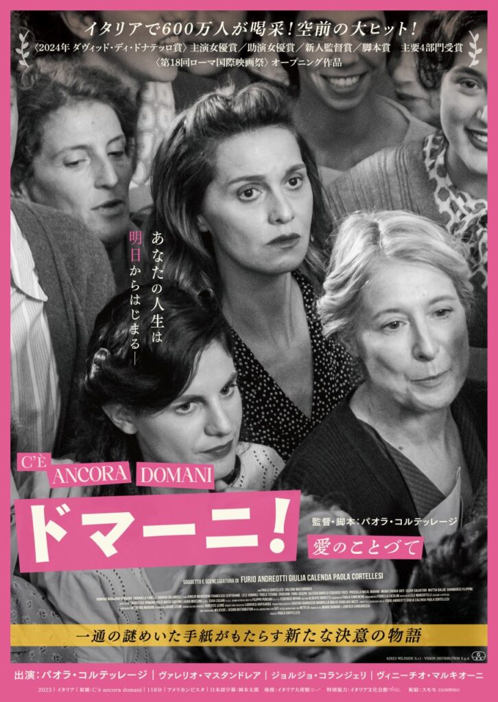 本国イタリアで 600 万人を動員し、世界的に大ヒットを果たしたハリウッド映画『バービー』『オッペンハイマー』を押しのけて、2023年のイタリア国内興行収入ランキングNo.1の大ヒットを記録した『ドマーニ! 愛のことづて』。イタリア歴代興行収入ランキングでも、あの『ライフ・イズ・ビューティフル』を抜いて第5位に。さらに、イタリア版アカデミー賞と言われる第 69 回ダヴィッド・ディ・ドナテッロ賞では最多 19 部門にノミネートされ、主演女優賞、助演女優賞、新人監督賞、脚本賞の主要4部門で最優秀賞に輝いた。