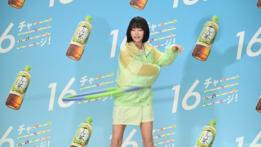 発表会では、「アサヒ 十六茶!フラフープチャレンジ!」と題した企画も実施された。普段運動はあまりしないというanoさんが、CMキャラクターの新垣結衣さんが挑戦したフラフープに挑んだ。