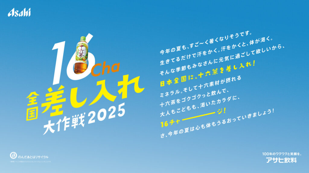 本施策は、生きているだけで汗をかく。汗をかくと、体が渇く。そんな季節もみなさんに元気に過ごしていただきたいという想いから、「日本全国に、十六茶を差し入れ!」をテーマに、全国に『アサヒ 十六茶』をお届けしております。