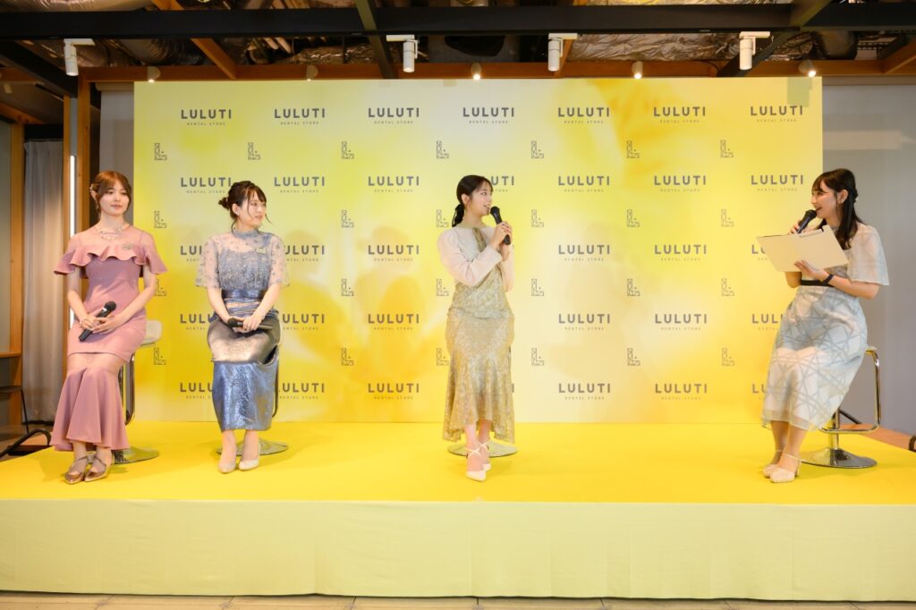 その後、雑誌『BAILA(バイラ)』のレギュラーモデルとして活躍し、テレビやCMでもおなじみの貴島さんが、LULUTIのドレスをまとい華やかに登場。また、ここからは、LULUTI HARAJUKUの店長・東堂、店次長・伊藤も加わり、3名によるトークセッションが行われた。