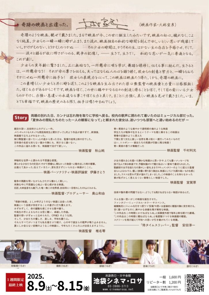 柴⼝勲監督作品「隣⼈のゆくえ〜あの夏の歌声」が、今年も池袋シネマ・ロサにて2025年8⽉9⽇より再上映される。本作は、⼭⼝県下関市で1⼈のサラリーマンと約40⼈の中⾼⽣によって制作された⾃主制作映画でありながら、第8回⽇本芸術センター映像グランプリ 感動賞、第3回 新⼈監督映画祭 ⻑編部⾨準グランプリをはじめ様々な賞を受賞し、⽇本各地の商業劇場にて上映していただきました。また、この作品は⼤林宣彦監督の⽬に留まり、⽣前直筆のお⼿紙を送っていただいたエピソードも。