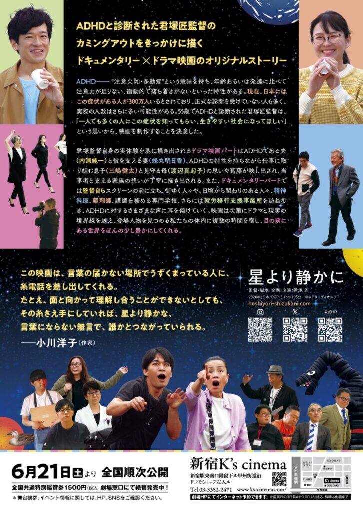ADHDをテーマにした映画『星より静かに』が2024年6月21日(土)に全国公開され、新宿K’s cinemaにて初日舞台挨拶が行われた。本作は、日本に300万人いるとされる注意欠如・多動症(ADHD)をテーマに、ドキュメンタリーとドラマを融合させて描かれた作品です。舞台挨拶には、君塚匠監督をはじめ、内浦純一さん、蜂丸明日香さん、三嶋健太さん、渡辺真起子さん、森重晃プロデューサーが登壇しました。