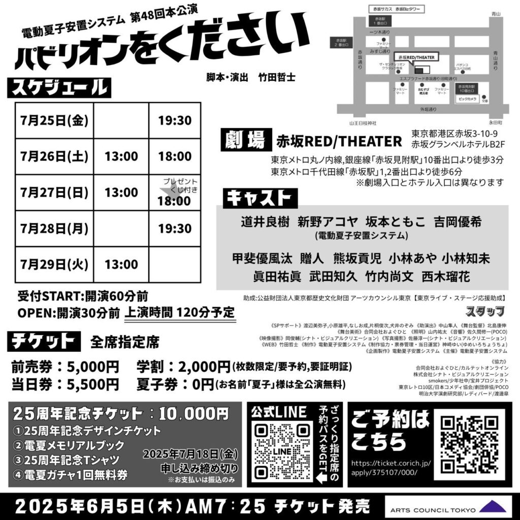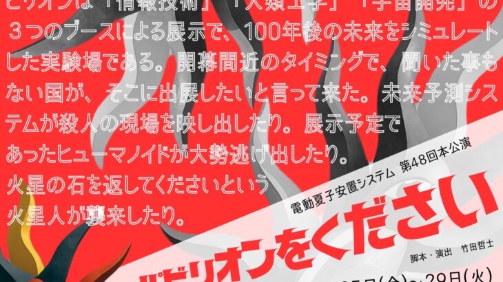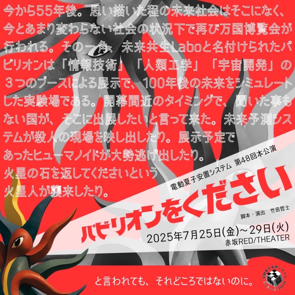 2025年7月25日(金) 〜 2025年7月29日(火)、赤坂RED/THEATERにて、演劇ユニット「電動夏子安置システム」が、記念すべき第48回本公演として、予測不能な未来社会を描くSFコメディ『パビリオンをください』を上演。
