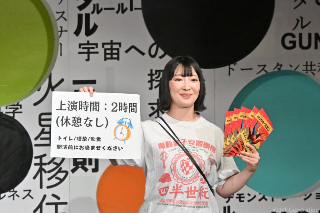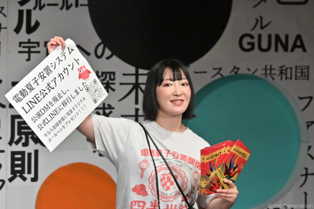 坂本ともこさんの手には、電動夏子安置システムのLINE公式アカウントのや、本公演の公演時間の紹介も。