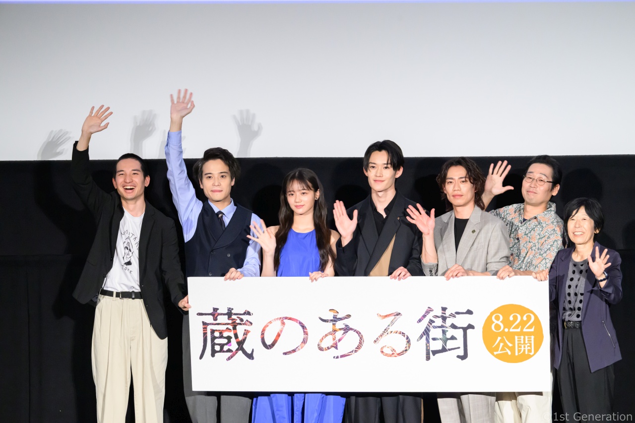 山時聡真さんと中島瑠菜さんがダブル主演を務める映画『蔵のある街』の完成披露舞台挨拶が7月29日(火)、新宿ピカデリーにて行われ、主演の山時聡真さん、中島瑠菜さん、共演の櫻井健人さん、堀家一希さん、プロフィギュアスケーターの高橋大輔さん、前野朋哉さん、そして平松恵美子監督が登壇した。コロナ禍に全国で打ち上げられた「サプライズ花火」のエピソードから生まれた本作は、岡山県倉敷市を舞台に、幼なじみとの約束を果たすため街に花火を上げようと奔走する高校生の姿を描いている。