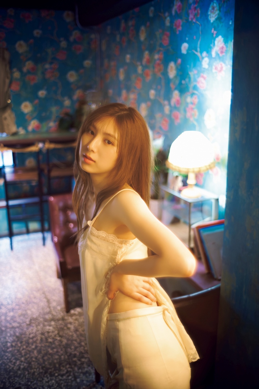 私が泊まっていたホテルのサービスルームみたいなところにピッタリの壁があって。オシャレなキャミソールとスカートでこの場所で撮らせていただきました。誰もが入れる場所なんですが、光がアンニュイな感じで撮れたので。1st写真集は明るい感じだったんですが、台湾だからできた曇り具合でアーティストっぽい感じの写真を撮らせていただきました。
