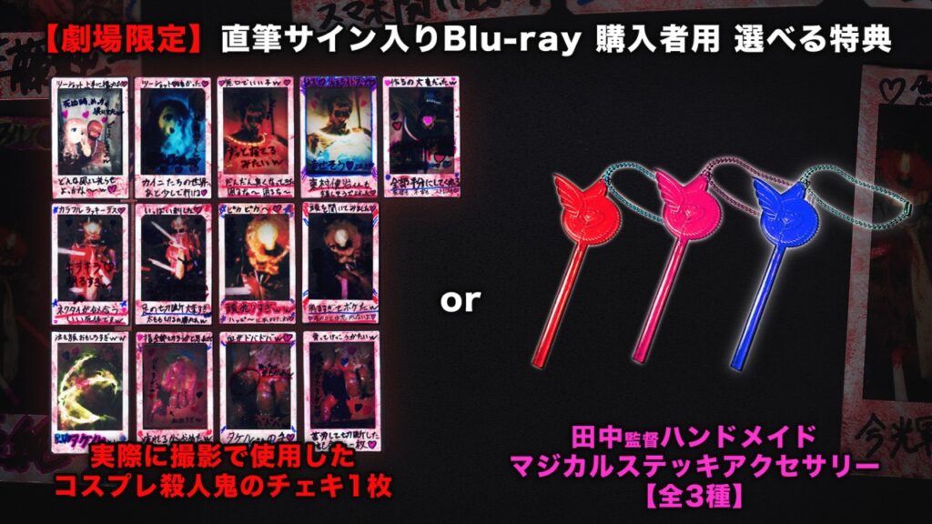 - さらに、サイン入りBlu-ray購入者特典として、撮影で実際に使用されたコスプレ殺人鬼のチェキ、または劇中で印象的なマジカルステッキ型の凶器を模した監督ハンドメイドのアクセサリーのいずれか一つがプレゼントされる。