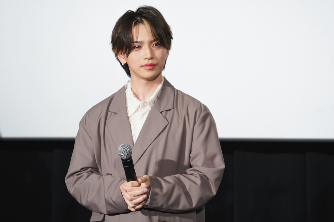 裕斗役を務め、本作のテーマ曲「Bless me」も手がけた岩橋はクランクインでの裏話を披露。「初日の朝はとても早かったのですが、工事現場の衣装のタンクトップを着て、ちょっと泥だらけになった感じで、待機していました。待機場所の近くには、本物の工事現場の方も結構いて。朝早くから牛丼を食べに行ってました。実は、僕もマスクなしでみんなに紛れて牛丼を食べに行ったのですが、全然バレなくて。本物の現場の人に馴染む感じで、役作りは完璧でした!」と胸を張ると、会場から大きな拍手が湧き起こっていた。