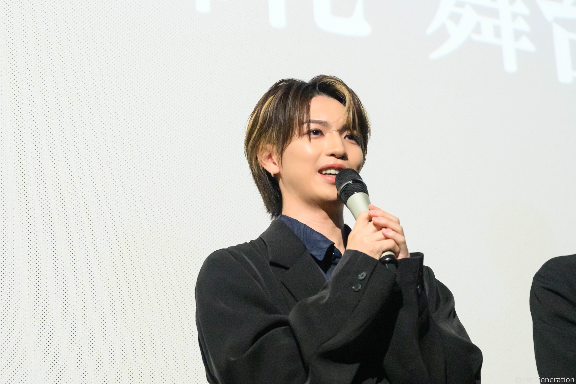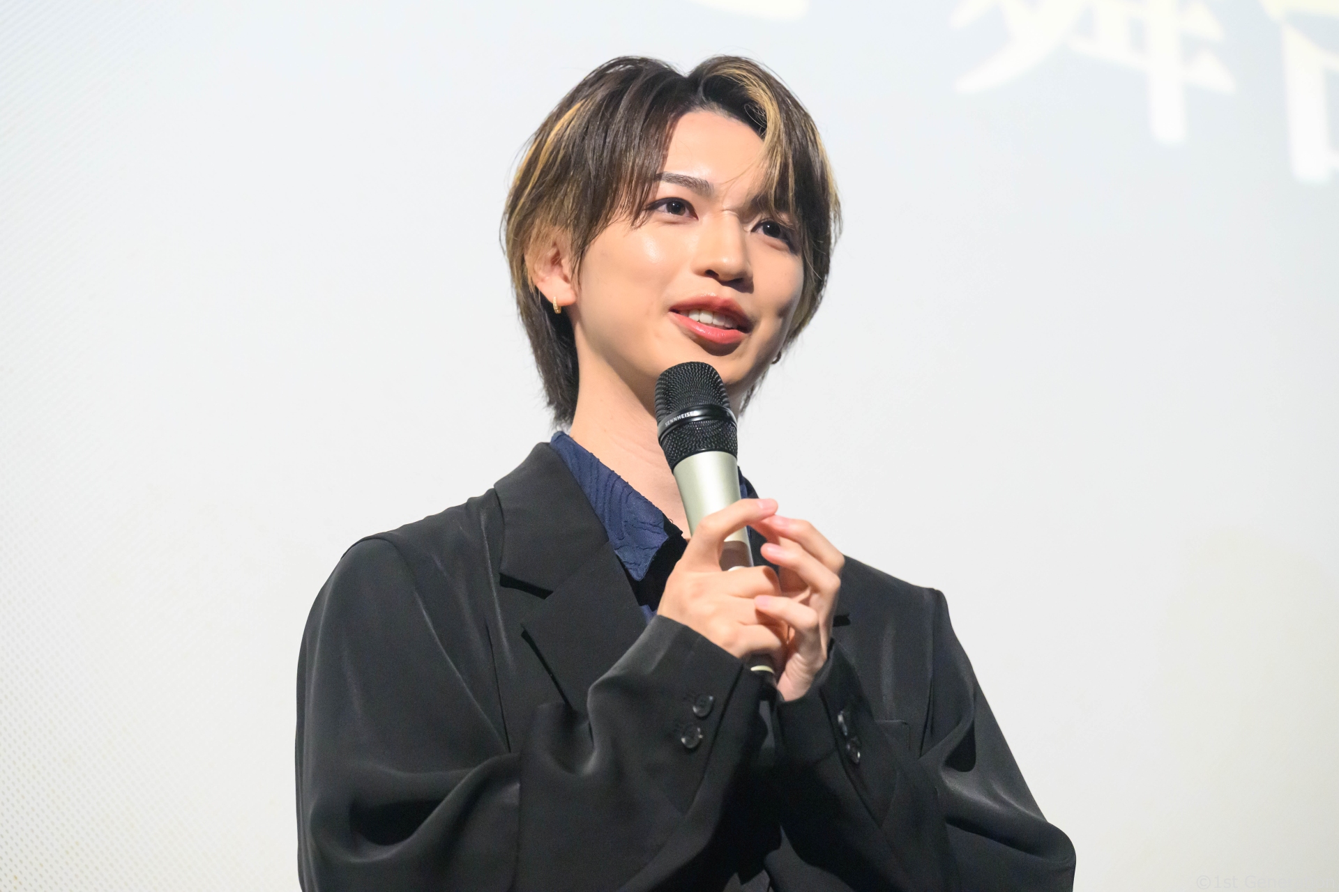 「ストーリーについては玄樹くんが話してくれたので、僕は演じたキャラクターについて話します」とした加藤は「僕が演じた山伏という役は、お坊さんのひとつで、生き霊、悪い霊と戦う人です。紫色の着物を着た時は特別な人と戦う時です」と劇中で紫色の衣装を着て戦っていた理由を説明。上映後の舞台挨拶で観客が内容を踏まえていることもあり、加藤は役どころのみをシンプルに紹介した。