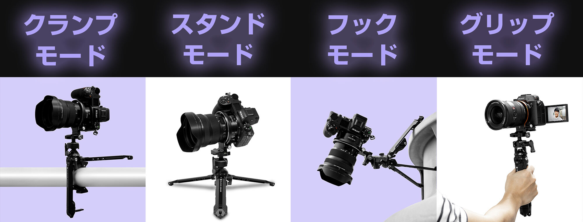 カメラクランプ+三脚の新発想!画期的なクランプモード&フックモードを搭載