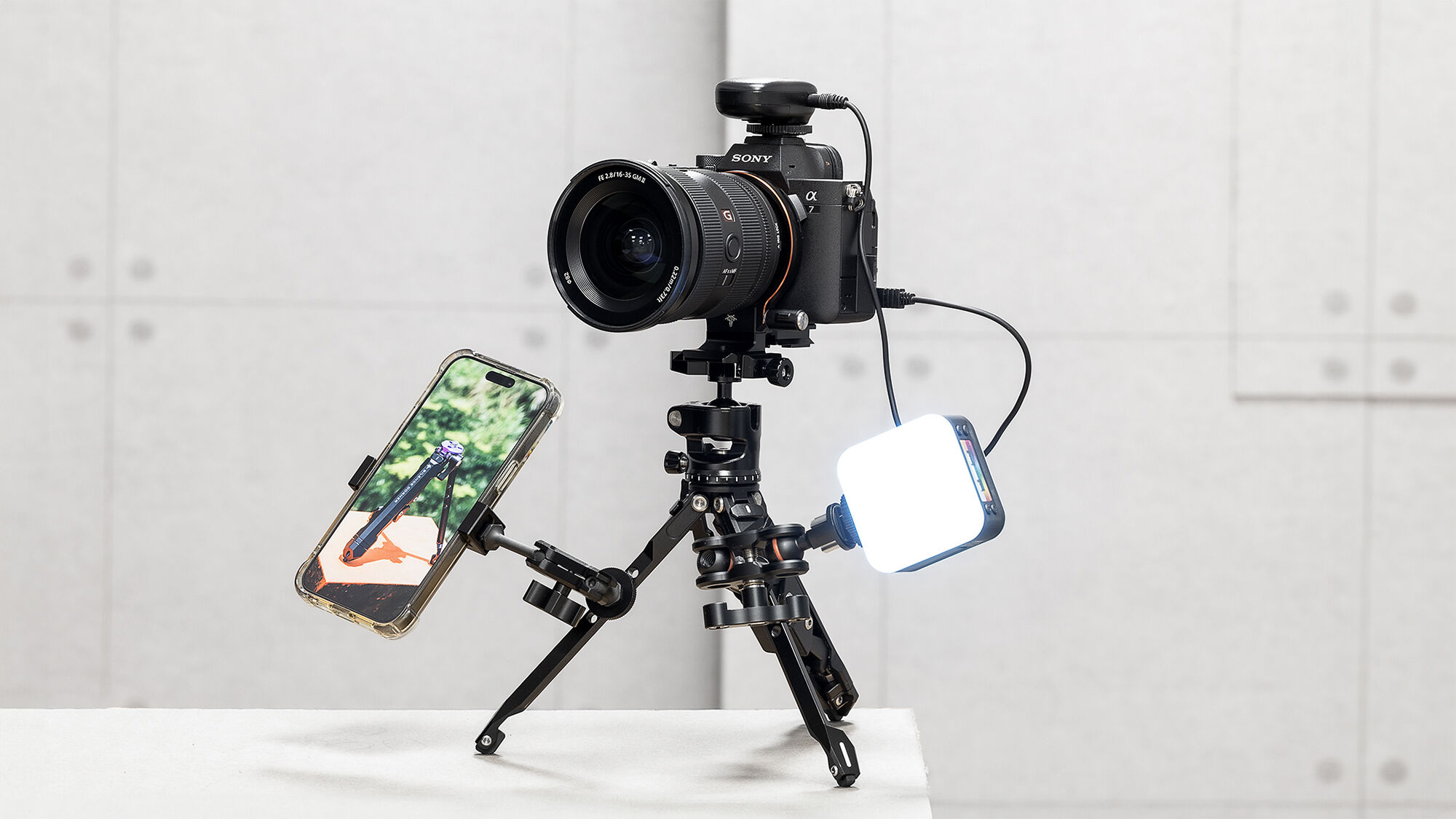脚部には複数の補助光やスマホを取り付け可能。高さ調整もできるから、デスクトップ撮影や自撮りにも最適!省スペースで多彩な撮影をサポートし、あなたの撮影空間をスッキリ整理!