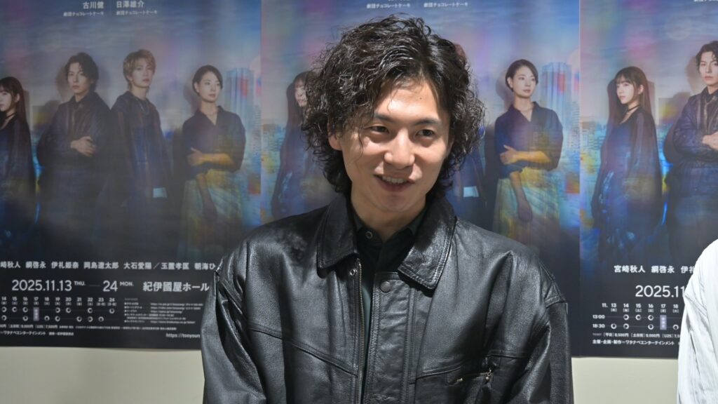 公開ゲネプロ前の劇場ロビーに、演出を務める日澤雄介、宮﨑秋人(本郷信吾役)、綱啓永(ジャック役)、朝海ひかる(亀山裕子役)が登場し、囲み取材に応じた。