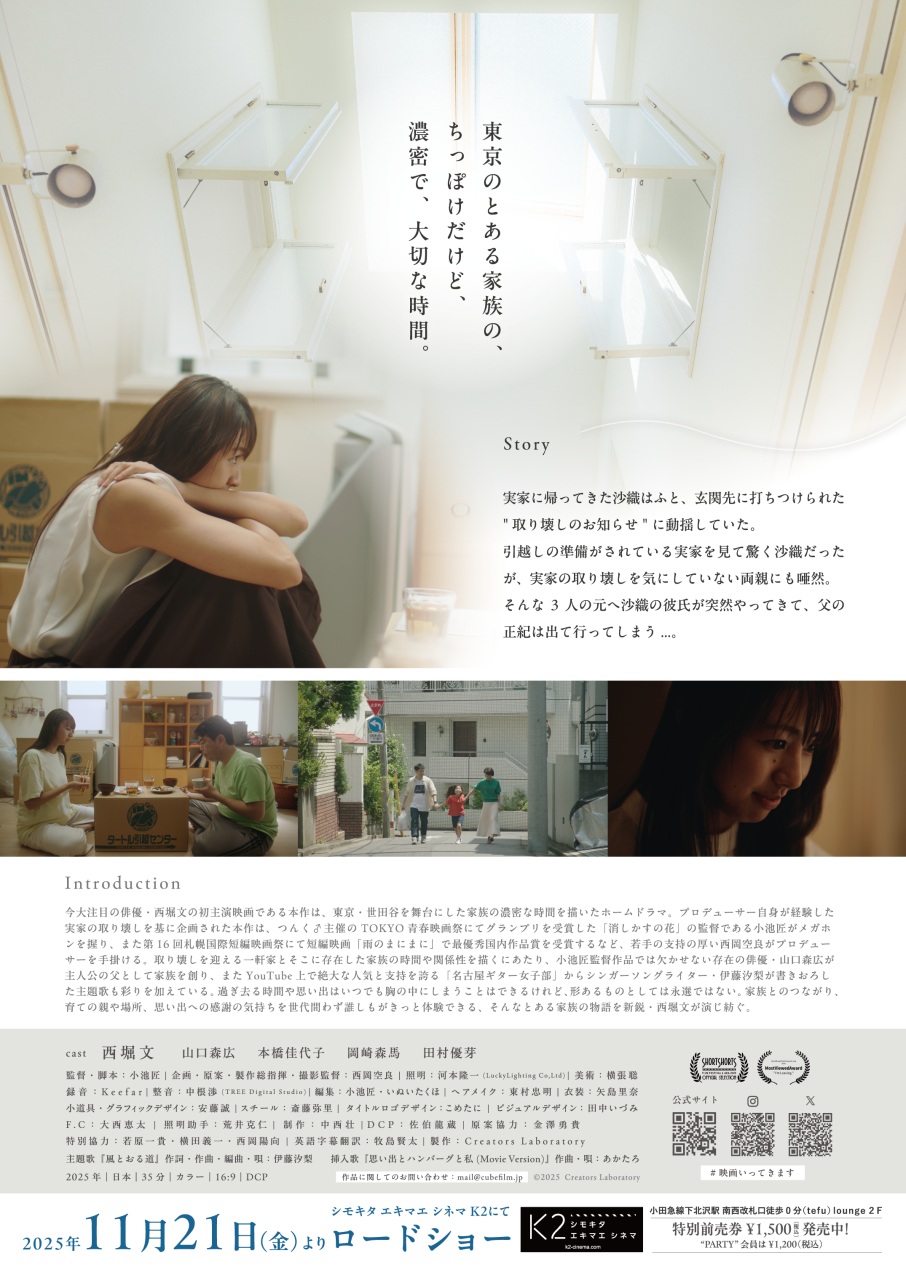 “ぶんちゃん”として今 tiktokで大人気の女優 西堀文(にしぼりあや)が初主演を務める本作は東京・世田谷を舞台にした家族の濃密な時間を描いたホームドラマ。 プロデューサー自身が経験した実家の取り壊しを基に企画された本作は、つんく♂主催のTOKYO 青春映画祭に てグランプリを受賞した 『消しかすの花』 の監督である小池匠がメガホンを握る。