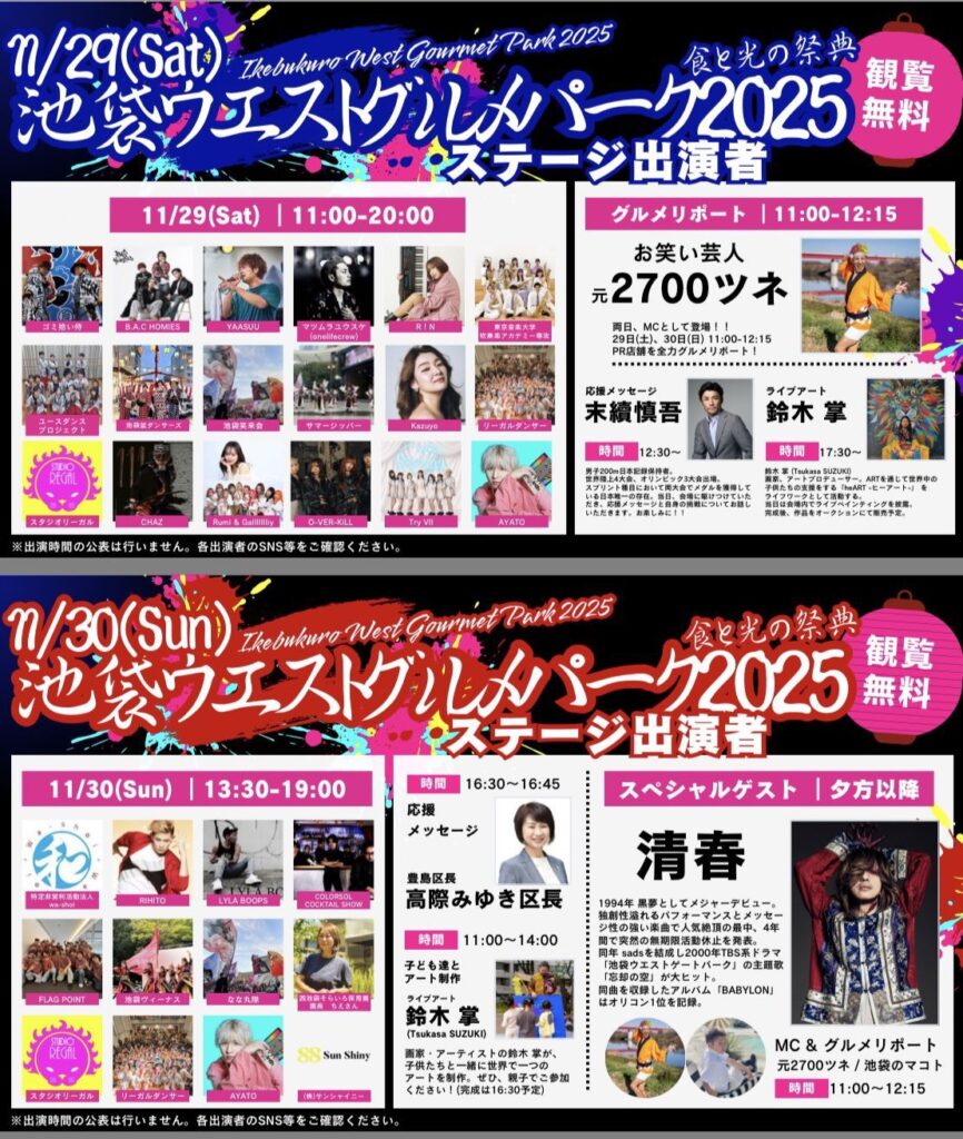 11月30日には清春のライブステージが決定(夕方以降予定)! 池袋を舞台にした人気ドラマ「池袋ウエストゲートパーク」(TBS系)の主題歌「忘却の空」(Sads)を作詞・作曲した清春が、池袋の空の下どんな歌声を聞かせてくれるのか注目です。