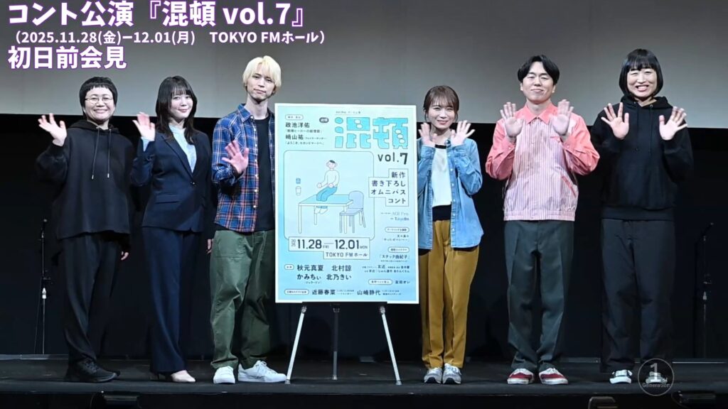 AOI Pro.コント公演『混頓 vol.7』の開幕を翌日に控えた11月27日、TOKYO FMホールにて、初日前会見が開催された。政池陽佑氏(『戦隊ヒーローの経理部』)と﨑山祐氏(ファイヤーサンダー/『ようこそ、セカンドマートへ』)による新作コント二本立てとなる本公演には、秋元真夏氏、北村諒氏、かみちぃ氏(ジェラードン)、北乃きい氏らが出演。日替わりゲストとして近藤春菜氏(ハリセンボン)と山﨑静代氏(南海キャンディーズ)も加わり、多彩な登壇者が稽古の感想と意気込みを語った。