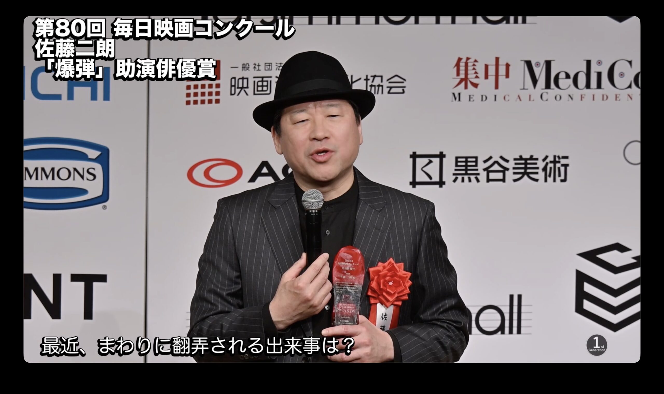 続いて、男優助演賞の佐藤二朗が登壇した。受賞の反響について佐藤は、家族や友人、同年代の役者から祝福されたことを明かし、「同年代から『刺激になった、自分も頑張らなきゃいけない』と言ってもらえたことが嬉しく、刺激を与える存在になれたことが誇らしい」と語った。誰に喜びを伝えたいか問われると、「やはり妻」としつつも、俳優の山田裕貴から熱烈な祝福メールが届き、「お互い頑張ろう」と励まし合ったことを紹介した。家族の反応については、妻からは「良かったじゃん」と一言だけだったと笑わせ、息子には受験等のプレッシャーを与えないよう受賞を伝えていないと明かした。