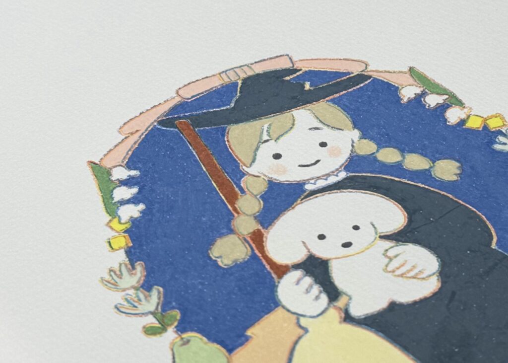 『魔女の犬』の原画は、一部をのぞき抽選販売をおこないます。また、たくさんの絵のなかから選んだ5点をジークレー(高精細プリント複製画)にしました。吉澤さんとてらおかさんおふたりのサイン入りのジークレーも、限定数でご用意します。なお、「サイン入り」が完売のあとも、受注生産に切り替えて予約販売を受け付けます。いずれも会場のみでの受付・販売です。(くわしいご案内は会場でご確認ください)