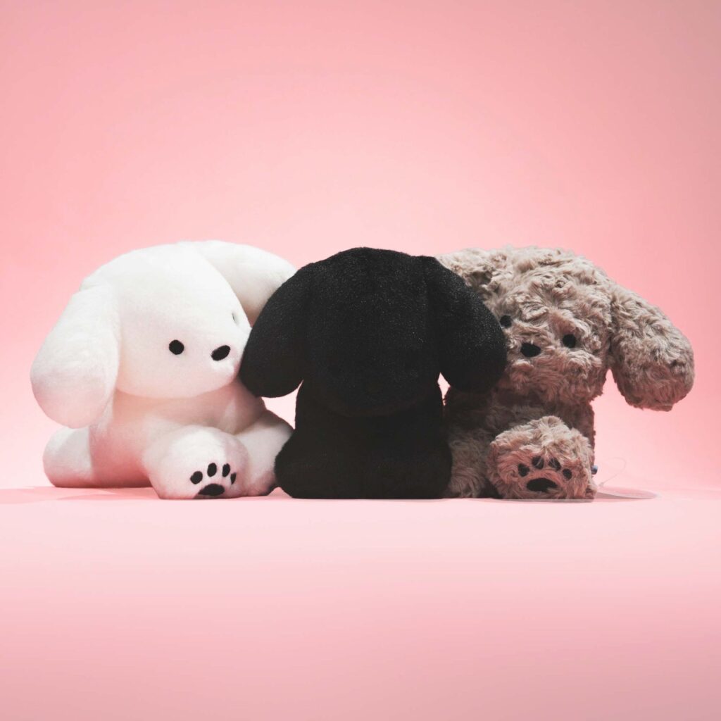 今回のコラボレーションを記念し、新色の「いぬのぬいぐるみ」をつくりました。白のぬいぐるみは、以前開催されたてらおかなつみさんの展覧会でうまれた大人気アイテムです。吉澤嘉代子さんもいっしょに毛の色を決め、生地をえらび、「はいいろ」と「くろいろ」が仲間入りしました。