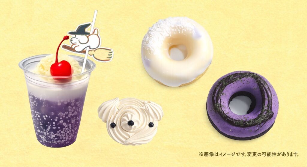 会場にはちいさなカフェスタンドがあります。そこでご用意するのは、絵本をモチーフにした「魔女のクリームソーダ」と、「魔女のドーナッツ」、「犬のドーナッツ」です。「魔女のクリームソーダ」は魔女をイメージした紫色。本展限定のかわいいストローマーカーも必ずついてきます。また、奈良県橿原市にある「caféひそひそ」さんがつくる「犬のメレンゲ」つきもご用意します。