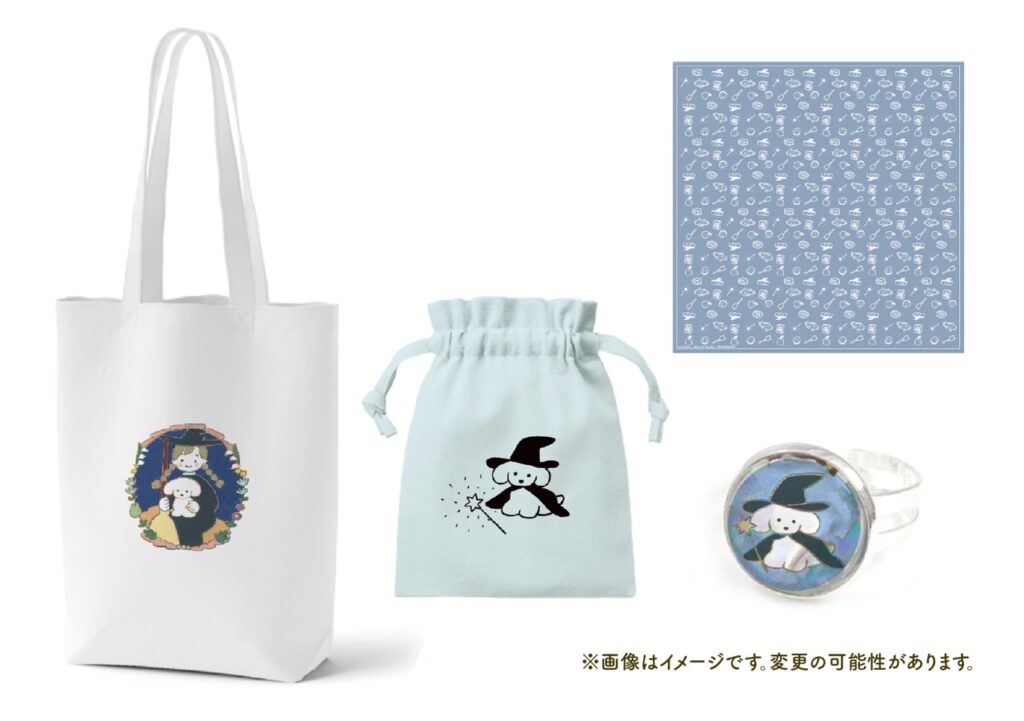 絵本のために描かれたてらおかさんの絵が、トートバッグ、巾着、ハンカチ、指輪になりました。ハンカチは「いぬのぬいぐるみ」にバンダナのように巻くのもおすすめです。指輪以外のオリジナルアイテムは「ほぼ日曜日」のWEBショップでもお求めいただける予定です。