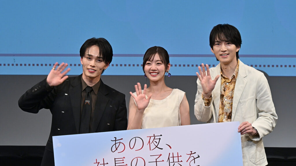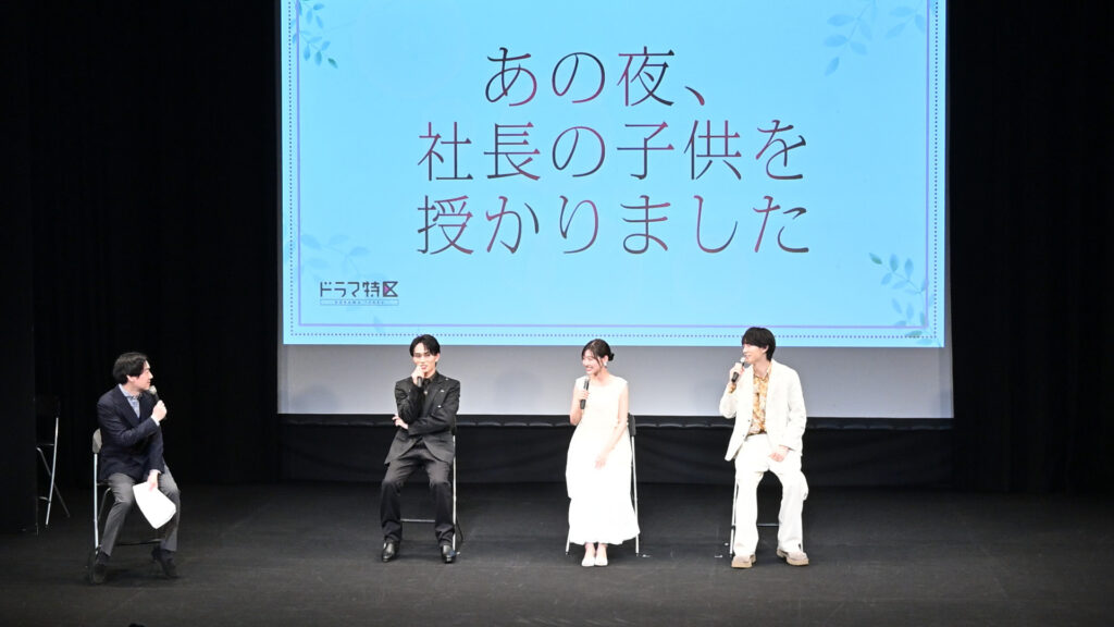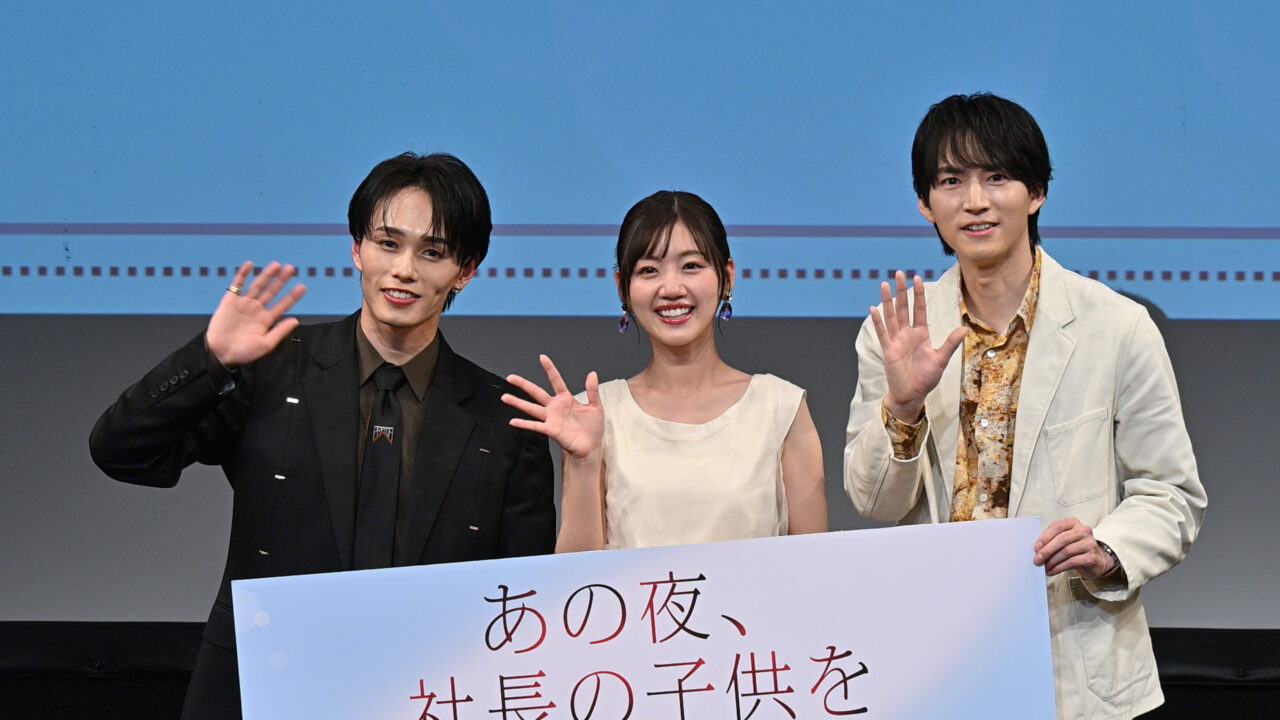 4月16日からの放送開始に先駆け、新ドラマ「あの夜、社長の子供を授かりました」の第1話先行上映およびトークイベントが4月15日、東京のCBGKシブゲキ!!にて開催された。本作は、一夜の過ちから予測不能な運命に巻き込まれるヒロインと、彼女を溺愛する新社長が織りなす波乱のラブストーリーだ。イベントには、W主演を務める佐々木美玲と森次政裕(超特急)に加え、サプライズゲストとして共演の和田雅成が登壇し、撮影の裏話やゲーム企画で会場を大いに盛り上げた。