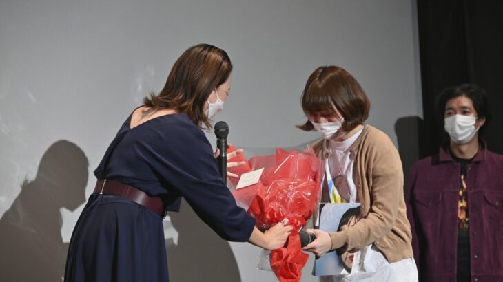 上映最終日となるこの日、玉井景役の主演・藤原麻希さんから、上映期間中に毎日のように池袋シネマロサに通い続けた野本梢監督に花束が贈られた。